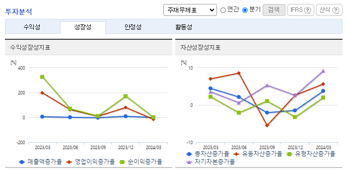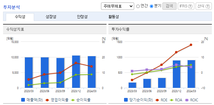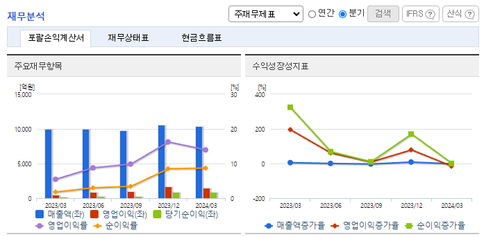 -2024년 3월 전년동기 대비 연결기준 매출액은 4.6% 증가, 영업이익은 167% 증가, 당기순이익은 457.2% 증가. 신차용 타이어 공급 확대 및 고수익 타이어를 비롯한 교체용 타이어 시장의 성장을 보이며 외형은 확대됨. 고수익 제품 중심의 구성 개선 및 글로벌 가격 안정화 등으로 영업이익은 전년동기 대비 두 배 이상의 성장세를 보임. 동사는 전기차 전용 브랜드인 이노뷔를 앞세워 프리미엄 시장 공략할 예정임.
