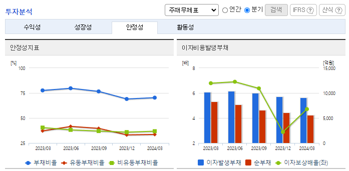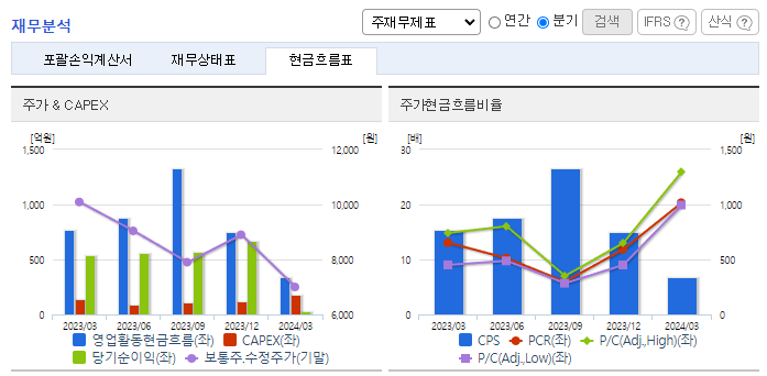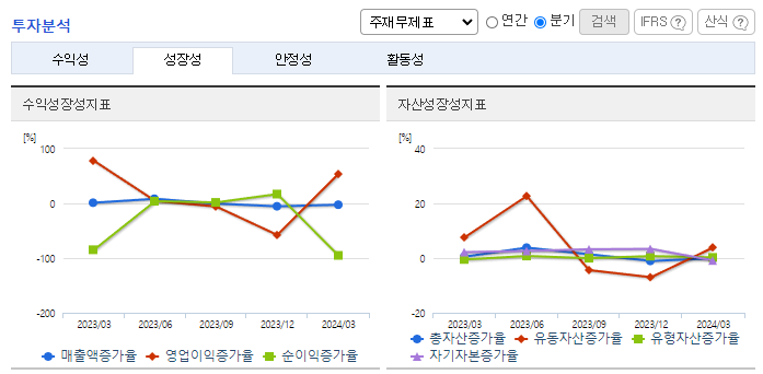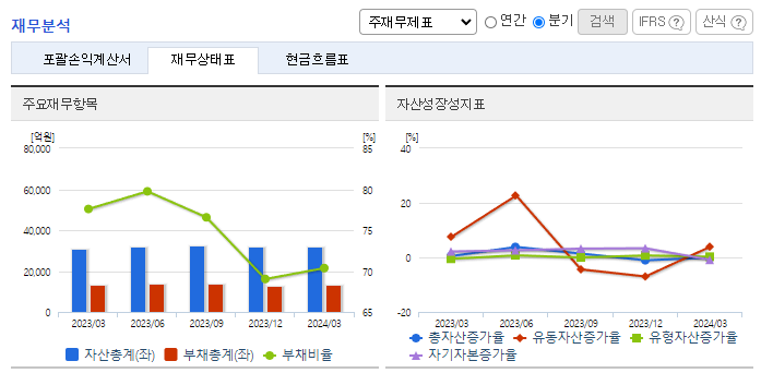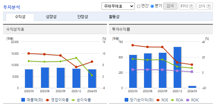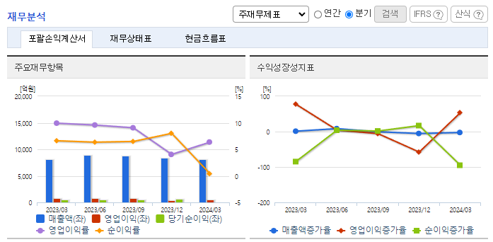 -2024년 3월 전년동기 대비 연결기준 매출액은 0% 증가, 영업이익은 35.9% 감소, 당기순이익은 92.6% 감소. 매출액은 전년동기 수준을 유지하였으나 원가율과 판관비 증가로 영업이익은 감소하였고 당기순이익은 크게 감소함. KG모빌리티가 KG그룹에 완전 편입되면서 동사의 차량용 철강재 판매 증가에 대한 기대감이 있음. 꾸준한 설비 투자와 기술 개발이 이뤄지고 있어 중장기적 관점의 기대감은 유효함.