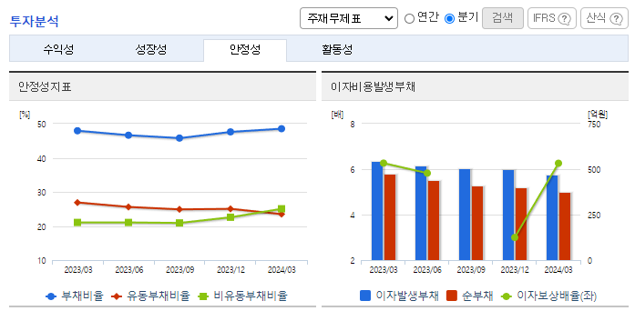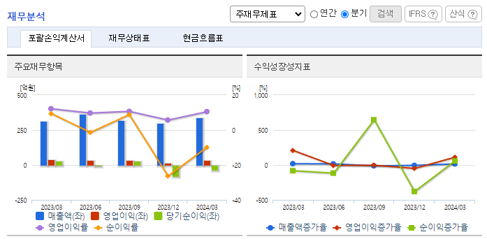 -2024년 3월 전년동기 대비 연결기준 매출액은 7.8% 증가, 영업이익은 6.9% 감소, 당기순이익 적자전환. 화장품 사업은 소비의 형태변화에 따라 현재의 소형 병원을 통한 B2B 유통에서 벗어나 온라인 및 홈쇼핑과 면세점, H&B스토어 등 OFF-LINE 유통망을 확대하고 있음. 동사의 자회사 씨엠에스랩의 다이소 뷰티 부문 매출은 올해 1분기에 전년 대비 150% 성장하는 등 'K뷰티'의 혜택을 받고 있음.