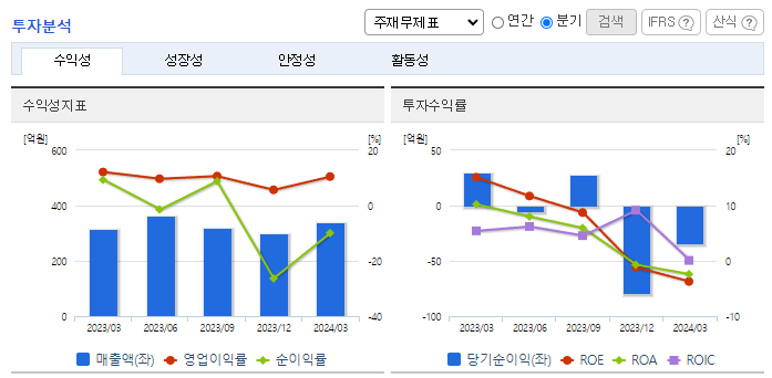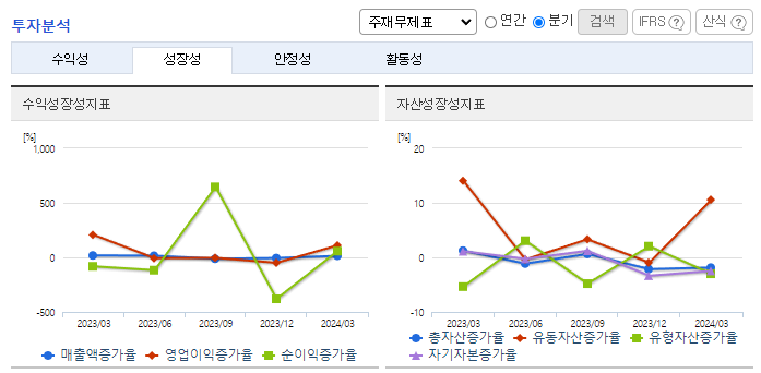 -2024년 3월 전년동기 대비 연결기준 매출액은 7.8% 증가, 영업이익은 6.9% 감소, 당기순이익 적자전환. 화장품 사업은 소비의 형태변화에 따라 현재의 소형 병원을 통한 B2B 유통에서 벗어나 온라인 및 홈쇼핑과 면세점, H&B스토어 등 OFF-LINE 유통망을 확대하고 있음. 동사의 자회사 씨엠에스랩의 다이소 뷰티 부문 매출은 올해 1분기에 전년 대비 150% 성장하는 등 'K뷰티'의 혜택을 받고 있음.