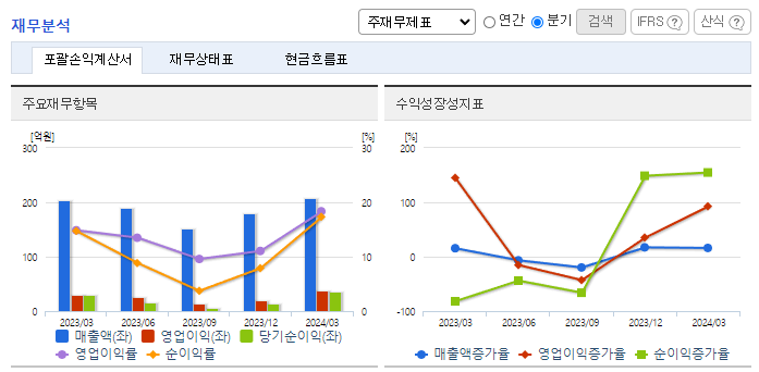 -2024년 3월 전년동기 대비 연결기준 매출액은 2% 증가, 영업이익은 25.9% 증가, 당기순이익은 20.3% 증가. 2023년 기준 매출액의 83% 이상이 해외 수출로 이루어져 있으며, 2017년~2023년 7년 동안 수출액은 270억 원에서 560억 원으로 2배 이상 성장하였음. 화장품 소재의 매출이 가장 높은 성장률을 보이고 있으며, 이중에서도 자외선 차단 소재가 가장 주력 제품임.