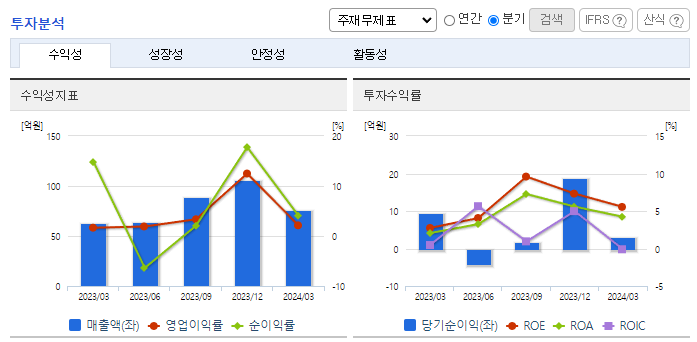 -2024년 3월 전년동기 대비 연결기준 매출액은 20.2% 증가, 영업이익은 54.3% 증가, 당기순이익은 66.8% 감소. 금융자동화의 Module 부문은 정밀 기술사업으로 신규 업체 진출이 용이하지 않은 사업으로 지속적인 기술개발과 연구를 통하여 신제품 개발 및 다양한 고객층 확보에 주력함. 특수단말시스템에서 마사회용 시스템, 스포츠토토발매기 및 J-TOTO발매기 등은 현재 전량 케이씨티를 통하여 수요처에 납품되고 있음.