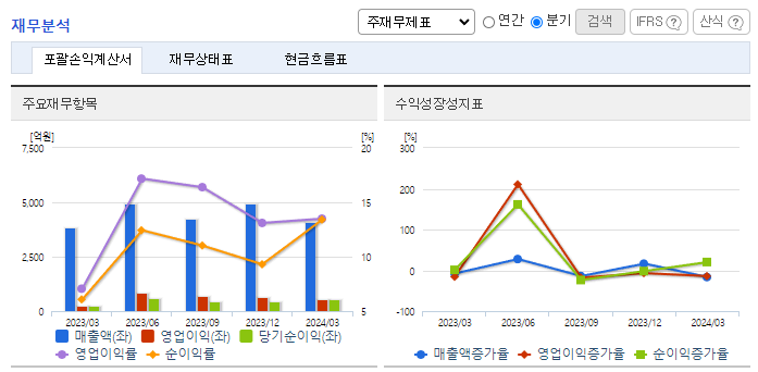 -2024년 3월 전년동기 대비 연결기준 매출액은 6.3% 증가, 영업이익은 103.4% 증가, 당기순이익은 141.2% 증가. 당기 포틀랜드시멘트의 가격은 내수가격을 기준으로 전년대비 5.6% 상승하였고, 레미콘의 가격은 5.7% 상승하였으며, 레미탈의 가격은 3.8% 상승함. 매출비중은 연결기준 시멘트 약 47%, 레미탈 약 26%, 레미콘 약 16% 그리고 기타 약 11%로 이루어져 있음.