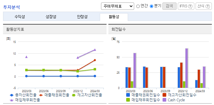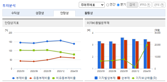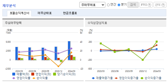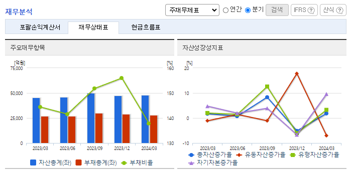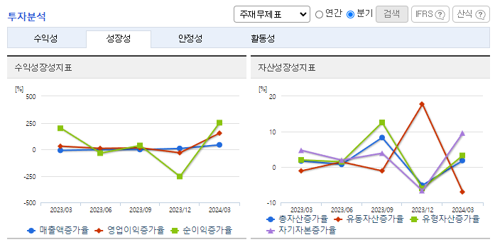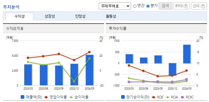-2024년 3월 전년동기 대비 연결기준 매출액은 45.2% 증가, 영업이익은 111.7% 증가, 당기순이익은 116.5% 증가. 주택분양 등 기타 사업 부문에서 오송바이오 융복합산업지구 아파트 분양사업의 실적에 힘입어 영업실적이 크게 개선됨. 또한 2023년부터 투입된 액화천연가스(LNG) 운반선 2척의 효율적 운영도 실적개선에 기여함. 용선시장의 불확실성과 관련된 위험을 최소화하여 안정적인 영업과 이익 극대화를 위해 노력 중임.