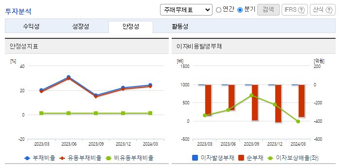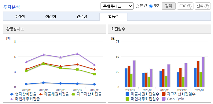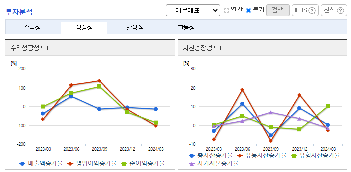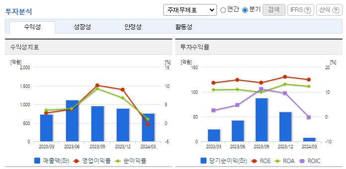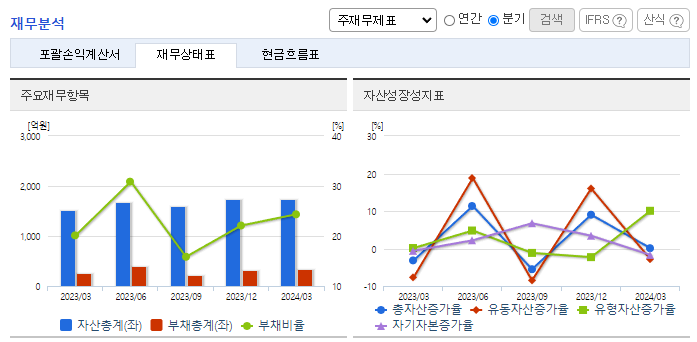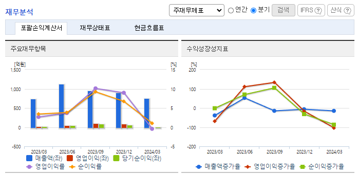 -2024년 3월 전년동기 대비 연결기준 매출액은 2.9% 증가, 영업이익 적자전환, 당기순이익은 69.6% 감소. 매출이 감소하고 영업이익이 전자로 전환된 이유는 매출원가율의 상승 때문임. INVERTER 및 OLED관련 원재료의 가격이 전년대비 상승함. OEM방식에서 탈피하여 제품생산을 통째로 외부에 맡기는 전자제품 생산 서비스 EMS 산업으로 전환되며 선두기업의 위치를 확대하고자 노력 중임.