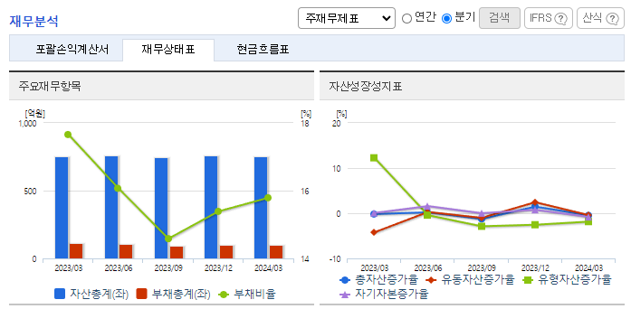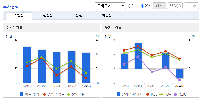 -2024년 3월 전년동기 대비 별도기준 매출액은 17.1% 감소, 영업이익은 489.1% 감소, 당기순이익은 164.3% 감소. 지난해 3분기 이후 계속되는 기어부문의 매출 부진으로 수익성 또한 비교적 큰 폭으로 하락한 상황. 전량 수입품에 의존하던 철도차량 동력 전달장치용 기어 국산화 완료되어 긍정적 영향을 기대하며, 내실 있는 관리를 통한 고정비 부담 완화 노력 지속 중.