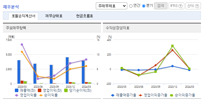 -2024년 3월 전년동기 대비 연결기준 매출액은 3% 감소, 영업이익은 40.2% 감소, 당기순이익은 45.9% 감소. 물가·고금리 장기화 영향에 따른 소비심리 둔화와 패션 시장 위축으로 어려운 시기를 겪고 있음. 통상적으로 1분기가 패션업계 비수기인 영향도 있어 매출액이 소폭 감소하였음. 자체 브랜드인 시스템과 타임의 프랑스 파리 진출을 본격화하고 6월에는 현지에 시스템·시스템옴므의 글로벌 플래그십 스토어를 선보일 계획임.