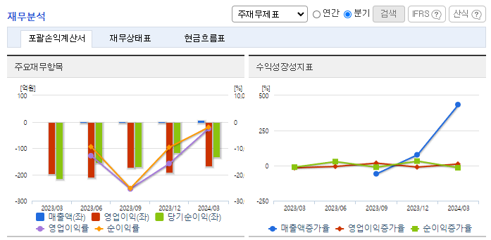-2024년 3월 전년동기 대비 연결기준 매출액은 0% 증가, 영업손실은 8.9% 증가, 당기순이익 적자전환. 매출은 발생하였으나, 판관비 영향으로 수익성은 아직 부진함. 동사는 연구개발, 임상, 상업화, 생산까지 풀 밸류 체인 시스템을 구축하고 있음. 올해 상반기 부산에 1만 평에 달하는 혁신신약연구원이 완공되면 혁신신약과 신규 바이오기술의 연구개발이 더욱 속도를 낼 것임.