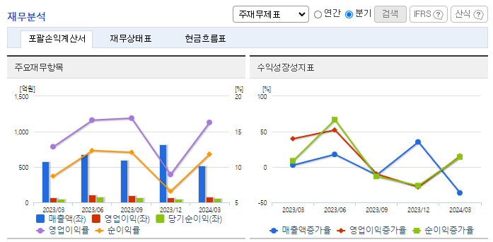 -2024년 3월 전년동기 대비 연결기준 매출액은 10.3% 감소, 영업이익은 13.7% 증가, 당기순이익은 20.8% 증가. 전년 동기 대비 조선 임가공 부분에서 20억 정도 매출이 상승하였으나, 일체형 Deck 부문에서 90억 정도 매출이 하락하며 매출 감소 유발. 중대재해 발생으로 23년 10월부터 2024년 6월 24일까지 8개월 토목건축공사업 영업정지 처분받음.