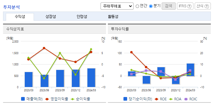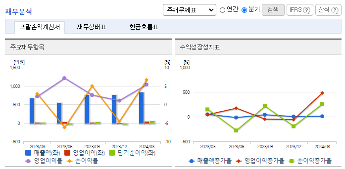 -2024년 3월 전년동기 대비 연결기준 매출액은 23% 증가, 영업이익은 207.6% 증가, 당기순이익은 162.5% 증가. 삼성전자와 거래관계를 구축하고 있으며, 국내경쟁사와 기술, 생산캐파, 품질 수준에 따라 물량경쟁을 하고 있는 상황이며, 갤럭시 출하량이 늘어나면서 동사의 매출액에 호조세를 띄게 됨. 군용으로 사용되는 Li/SOCl₂(리튬염화티오닐전지)의 Spiral type과 비축형 전지의 유일한 양산업체임.