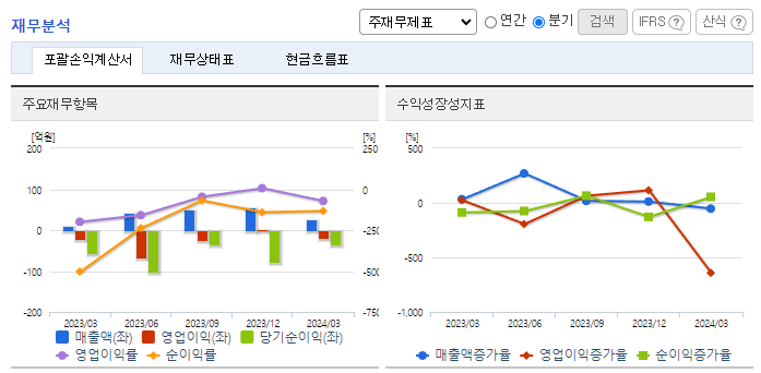 -2024년 3월 전년동기 대비 연결기준 매출액은 133.2% 증가, 영업손실은 16% 감소, 당기순손실은 37.4% 감소. 동사는 전략 수집 모바일 RPG(역할수행게임) '리버스 삼국'을 출시했고, 게임 유통을 통해 매출과 수익을 증대시킬 계획임. 동사는 '리버스 삼국' 외에 다른 신작 서비스도 준비하고 있는데, 연 10조 원 규모로 성장한 국내 모바일 게임 시장에서 RPG를 시작으로 다양한 장르의 게임을 출시할 계획임.