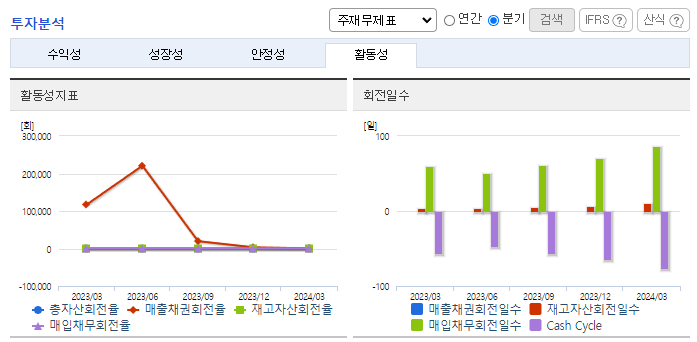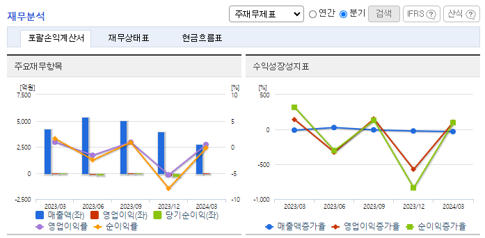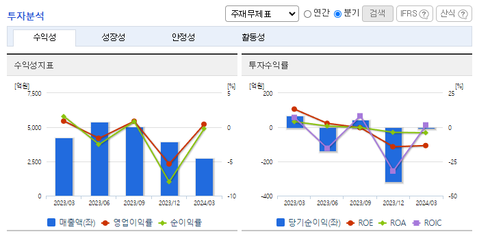 -2024년 3월 전년동기 대비 연결기준 매출액은 35.2% 감소, 영업이익은 68.3% 감소, 당기순이익은 78.1% 감소. 사우디아라비아, 말레이시아 및 베트남 등 주요 거점국 대상 해외 수주 활성화 및 엔지니어링 역량 향상을 통한 Value 엔지니어링으로 원가 경쟁력 확보에 노력. 동사의 전체 매출액 중 약 72 %를 차지하는 플랜트사업의 매출이 감소하고, 판매비와 관리비 등 비용은 증가하면서 영업이익이 약 68% 감소함.