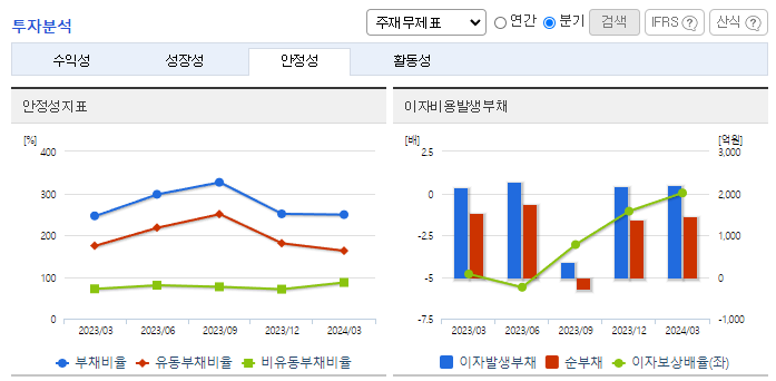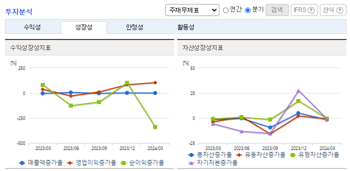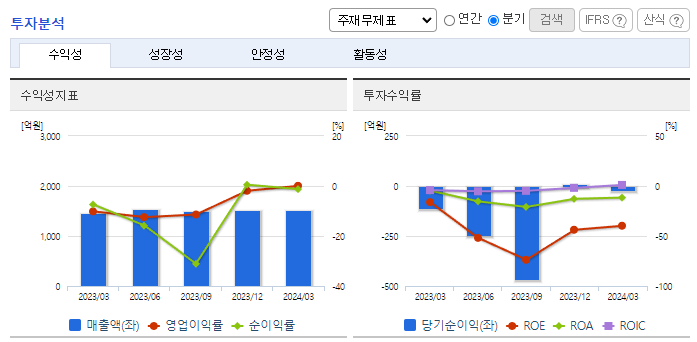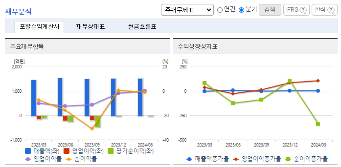 -2024년 3월 전년동기 대비 연결기준 매출액은 3.5% 증가, 영업이익 흑자전환, 당기순손실은 92% 감소. 신약 개발을 위해 제9 1분기말 기준 매출액의 약 1.54%에 해당하는 2,321백만 원의 연구개발비용을 지출하며 신약을 개발하기 위해 노력 중임. 24년 내 의약품 제조업 사업무문을 위한 청주공장과 안성공장의 설비보안을 위한 투자계획이 있으며, 생산능력장가 및 품질관리, GMP강화의 투자효과가 기대됨.