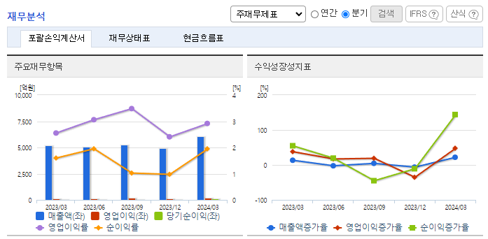 -2024년 3월 전년동기 대비 별도기준 매출액은 16.8% 증가, 영업이익은 33.4% 증가, 당기순이익은 42.7% 증가. 중고차 사업부문의 이커머스 판매 비중 확대 등의 실적 개선 노력을 통해 영업이익 증가. 완성차 업계를 포함한 대기업의 중고차 판매업 시장 진출이 공식적으로 가능해져, 완성차 업체를 포함한 기업형 사업자들이 중고차 소매 시장에 진입하고 있음.