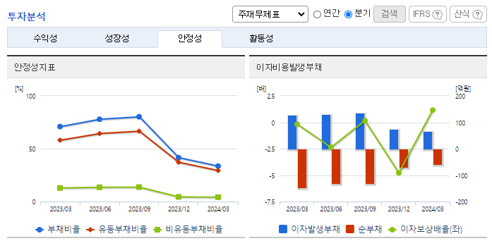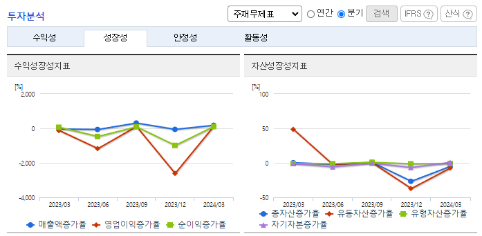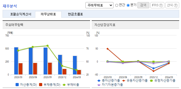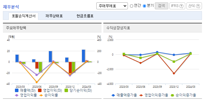 -2024년 3월 전년동기 대비 별도기준 매출액은 65.6% 증가, 영업이익 흑자전환, 당기순이익 흑자전환. 적외선 발광체 사업 부문이 94.47% 감소했지만, 근적외선 흡수/반사 안료 사업 부문이 265.71% 증가하면서 전체 외형 성장을 이끎. 스마트폰 카메라에 적용되는 적외선 필터에 동사의 근적외선 흡수/반사 안료의 원천 기술인 적외선 유기재료기술을 활용하여 적외선을 제어하는 파장 선택성 염료의 개발을 진행하고 있음.