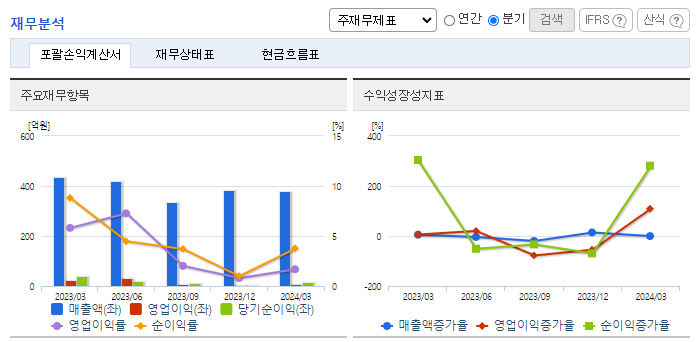 -2024년 3월 전년동기 대비 연결기준 매출액은 12.2% 감소, 영업이익은 74.7% 감소, 당기순이익은 62.5% 감소. 계절적 요인에 따라 연료관 사업부문의 매출은 10% 감소하였음. 영업이익률이 매출대비 큰 폭으로 감소한 이유는 판관비 및 인건비 등 고정비용에 따른 여파임. 연료관은 현재 동사를 비롯 국내 5개 사가 제품 생산, 국내외에 판매 중. 국내를 제외하고는 일본, 중국 등에서 동사의 자회사와 일본기업만이 제품 생산.