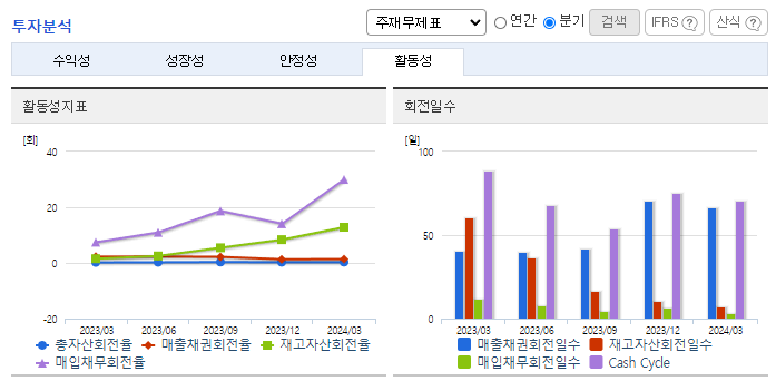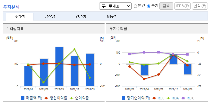 -2024년 3월 전년동기 대비 별도기준 매출액은 137.3% 증가, 영업손실은 21.2% 감소, 당기순손실은 3041.3% 증가. 로지텍의 쿠팡(로켓) 직납으로 인해 IT유통사업부의 매출이 큰 폭으로 상승하며 전년동기 대비 외형이 성장함. 바이오신약 부문에서의 매출은 아직까지 발생하고 있지는 않음. 바이오신약부문은 임상, 전 임상 등의 연구단계에 있으며 비마약성 진통제의 경우 최종 임상 1상을 완료한 후 기술이전을 추진하고 있음.