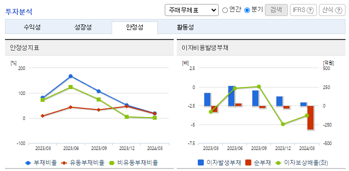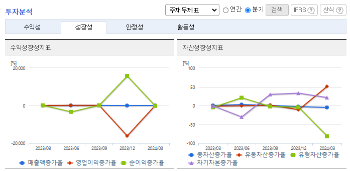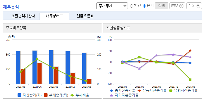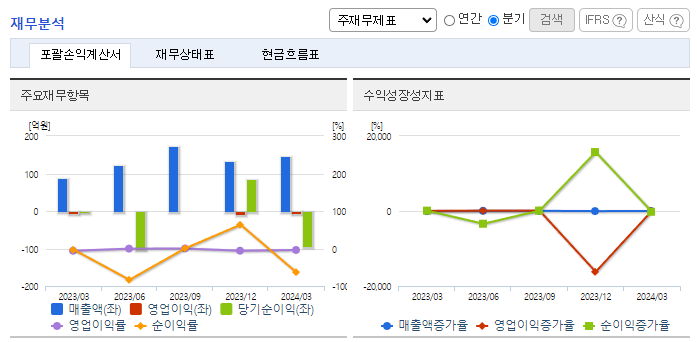 -2024년 3월 전년동기 대비 별도기준 매출액은 137.3% 증가, 영업손실은 21.2% 감소, 당기순손실은 3041.3% 증가. 로지텍의 쿠팡(로켓) 직납으로 인해 IT유통사업부의 매출이 큰 폭으로 상승하며 전년동기 대비 외형이 성장함. 바이오신약 부문에서의 매출은 아직까지 발생하고 있지는 않음. 바이오신약부문은 임상, 전 임상 등의 연구단계에 있으며 비마약성 진통제의 경우 최종 임상 1상을 완료한 후 기술이전을 추진하고 있음.