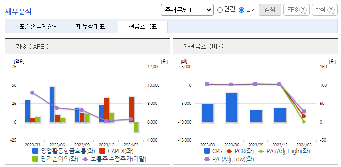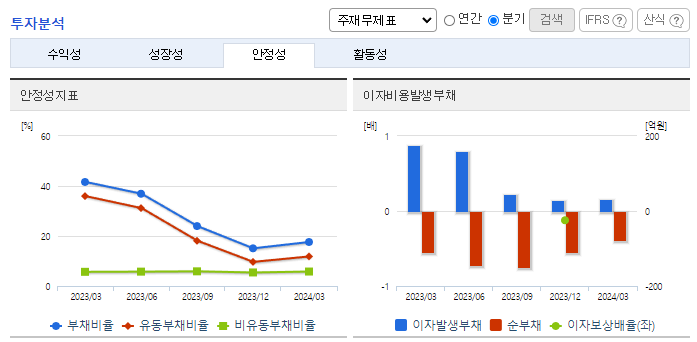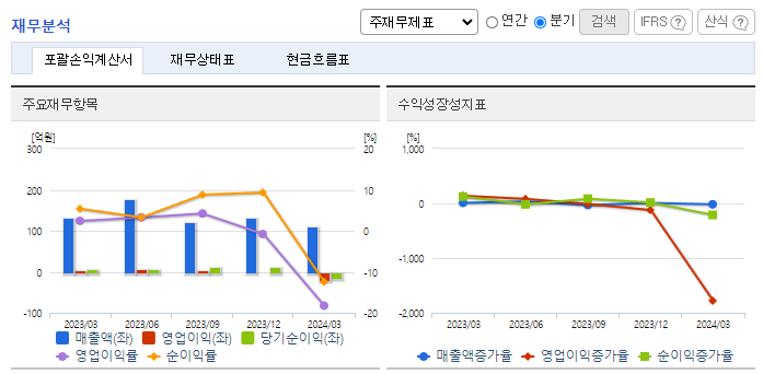 -2024년 3월 전년동기 대비 별도기준 매출액은 16.3% 감소, 영업이익 적자전환, 당기순이익 적자전환. 지난해 3분기 이후 주력 제품의 매출 상승세가 꺾이면서 지난해 같은 기간 대비 감소한 매출 시현함. 원가율 지속적으로 높은 수준 유지하고 있어 수익성은 상당히 크게 하락하고 있는 상황. RNA 치료제위 핵심 원재료인 뉴클레오시드의 시장전망 긍정적이나, 단기적으로 판가 회복 및 원가부담 축소가 실적 개선의 관건임.