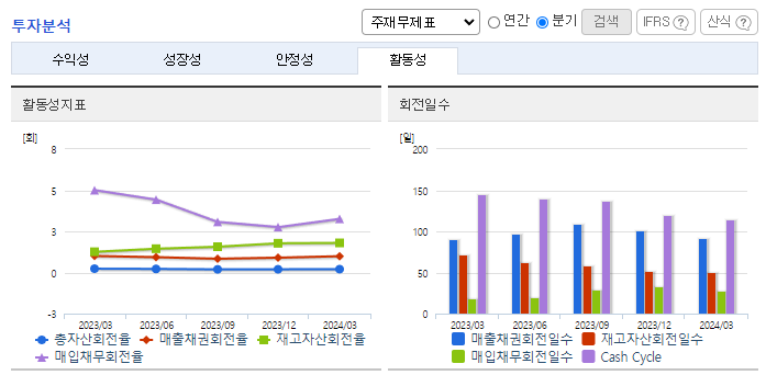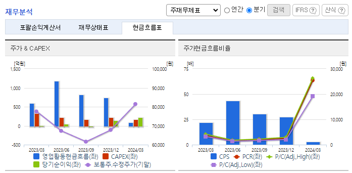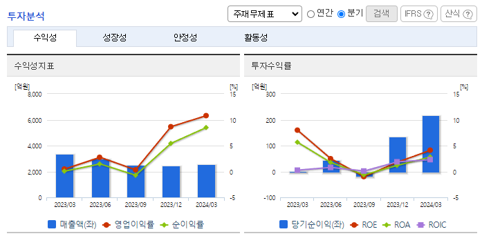 -2024년 3월 전년동기 대비 연결기준 매출액은 23.9% 감소, 영업이익은 1621.8% 증가, 당기순이익은 9235.8% 증가. 동사의 화학사업부 및 해외사업부의 매출이 모두 전년동기 대비 감소하였지만 KCl, LNG, NaOH, HCl 등의 원재료 가격이 전년동기 대비 약 36% 감소하면서 영업이익은 크게 증가함. 염화파라핀공장은 약 10만 톤/년 규모로 건설 중이며 2024년 2분기 가동을 목표로 하고 있음.