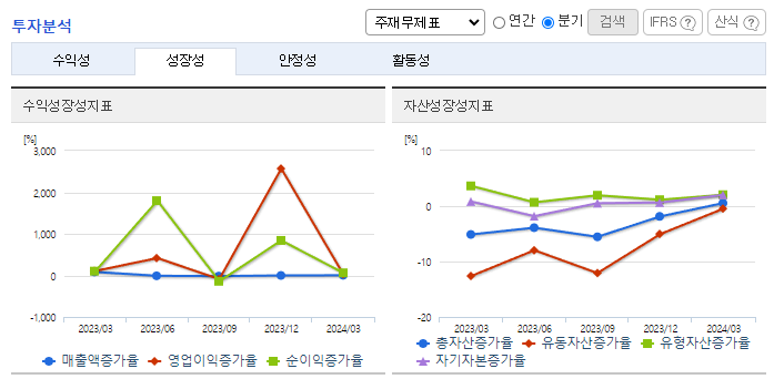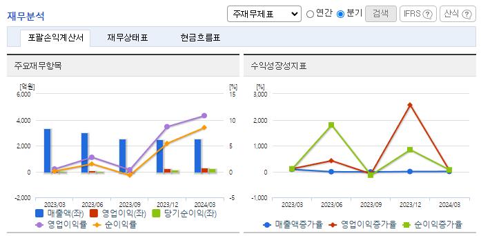 -2024년 3월 전년동기 대비 연결기준 매출액은 23.9% 감소, 영업이익은 1621.8% 증가, 당기순이익은 9235.8% 증가. 동사의 화학사업부 및 해외사업부의 매출이 모두 전년동기 대비 감소하였지만 KCl, LNG, NaOH, HCl 등의 원재료 가격이 전년동기 대비 약 36% 감소하면서 영업이익은 크게 증가함. 염화파라핀공장은 약 10만 톤/년 규모로 건설 중이며 2024년 2분기 가동을 목표로 하고 있음.