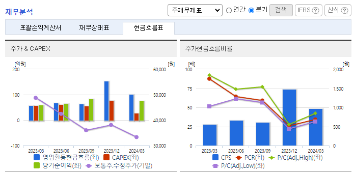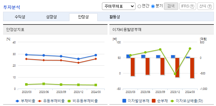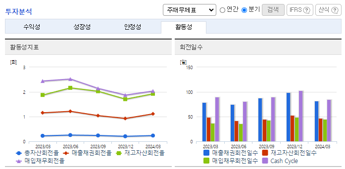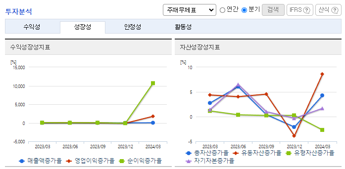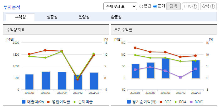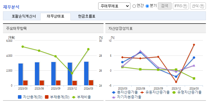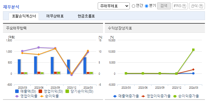 -2024년 3월 전년동기 대비 연결기준 매출액은 12.8% 증가, 영업이익은 8.5% 증가, 당기순이익은 25.1% 증가. MLCC, FC, DCC 등 주요 품목들의 매출이 모두 증가하였으며 특히 전장용/산업용 콘덴서 수요 확대로 매출이 증가함에 따라 수익 증가함. 신규 사업으로 태양광 가로등, 태양광 도로 표지판용 에너지 저장장치, E-mobility용 제품에 적용 가능할 수 있는 배터리 커패시터 개발을 진행 중임.