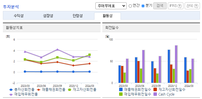 -2024년 3월 전년동기 대비 연결기준 매출액은 29.6% 감소, 영업손실은 158.1% 증가, 당기순손실은 14.2% 감소. 매출액이 감소했음에도 판매비와 관리비가 63.6% 증가하여, 영업이익에 악영향을 줌. 특히 인건비 및 복리후생비가 33.8% 증가함. 영업 외 손익에서 금융손익이 151.34% 증가하면서 영업이익이 감소했음에도 불구하고, 당기순손실이 축소됨.
