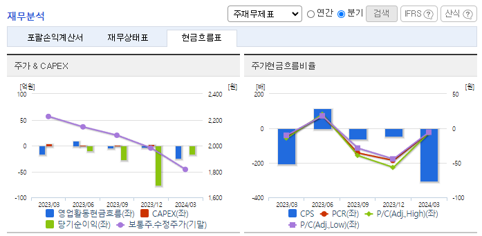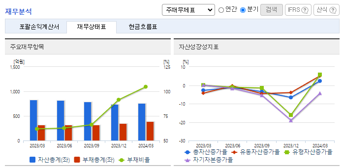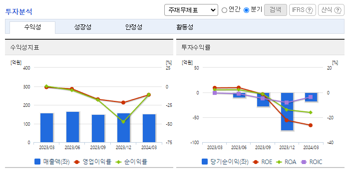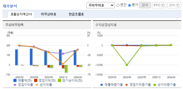 -2024년 3월 전년동기 대비 연결기준 매출액은 4.5% 감소, 영업손실은 752.2% 증가, 당기순이익 적자전환. 동사는 2019년 3억 원의 영업손실을 기록한 이후 5년째 적자를 이어오고 있음. 동사의 매출 비중의 70%를 차지하는 일반의약품은 의사의 처방전 없이 약국을 통해 손쉽게 구할 수 있지만 경기변동과 계절적인 영향을 받으며 경쟁사 제품으로 대체가 가능하다는 단점이 있음.