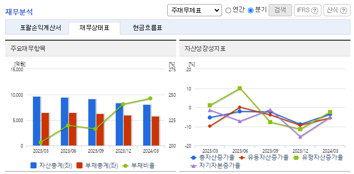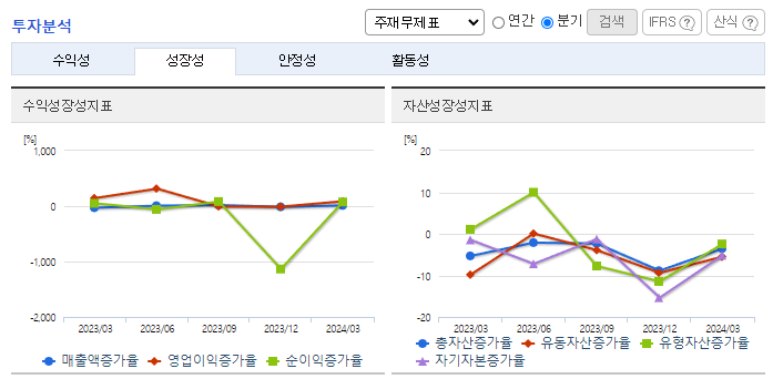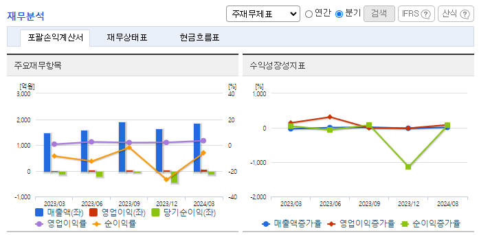 -2024년 3월 전년동기 대비 연결기준 매출액은 25.7% 증가, 영업이익은 558.9% 증가, 당기순손실은 4.6% 감소. 가정 중심의 미디어 시청 형태로 변화하며 IPTV 이용 및 VOD 매출이 증가할 것으로 예상하고 있고, 재택근무, 언택트 등 망 사용 산업의 변화가 본격화되고 있음. 신흥시장에서는 인터넷 사용 가구 수가 증가하고 있고, 선진시장에서도 인터넷 속도개선 교체수요가 활발하게 이루어지고 있어 성장이 예상됨.