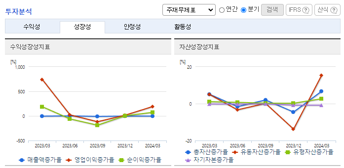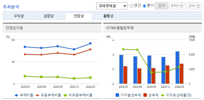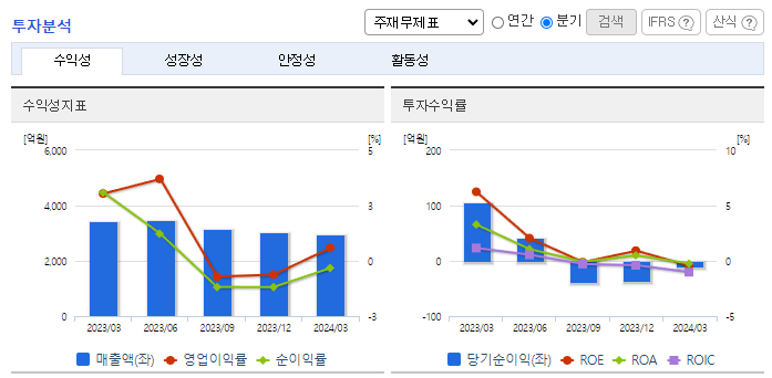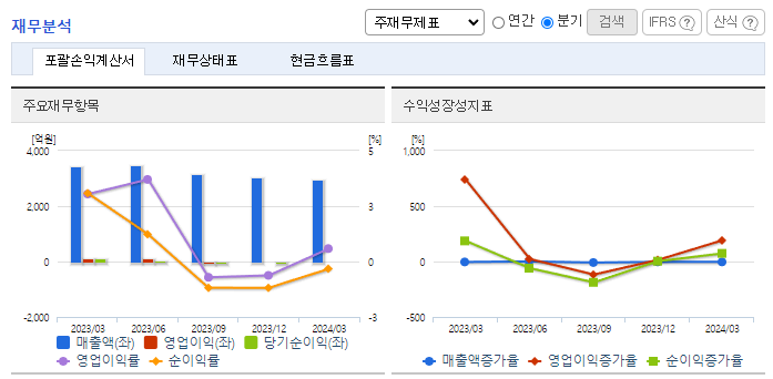 -2024년 3월 전년동기 대비 연결기준 매출액은 13.8% 감소, 영업이익은 83.4% 감소, 당기순이익 적자전환. 주력제품인 에폭시수지 제품의 판매 부진과 더불어 비용 상승으로 인해 영업수익성 큰 폭으로 하락한 상황. 중국시장 내에서 저가의 로컬 업체와 달리 고부가가치 제품 및 특수용도의 Polyol, 특수 산업분야 공략 등을 통해 비교적 안정적인 매출 유지해 왔으나 금년은 다소 어려운 환경.