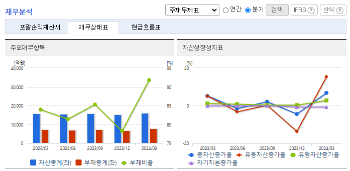 -2024년 3월 전년동기 대비 연결기준 매출액은 13.8% 감소, 영업이익은 83.4% 감소, 당기순이익 적자전환. 주력제품인 에폭시수지 제품의 판매 부진과 더불어 비용 상승으로 인해 영업수익성 큰 폭으로 하락한 상황. 중국시장 내에서 저가의 로컬 업체와 달리 고부가가치 제품 및 특수용도의 Polyol, 특수 산업분야 공략 등을 통해 비교적 안정적인 매출 유지해 왔으나 금년은 다소 어려운 환경.