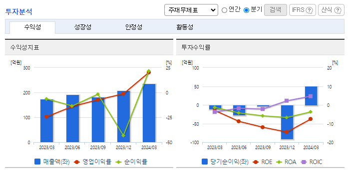 -2024년 3월 전년동기 대비 연결기준 매출액은 34.9% 증가, 영업이익 흑자전환, 당기순이익 흑자전환. 프리즘시트 매출은 다소 감소하였지만, 전년 동기 대비 회절격자, 파장판, 블루필터 등의 제품 매출이 크게 증가함과 동시에 비용도 절감하여 수익성 개선에 기여하였음. 동사는 AMOLED, Mini LED, 지문 인식 등의 관련 신규 사업 아이템을 개발 중에 있으며 성장 동력을 확보하고 있음.
