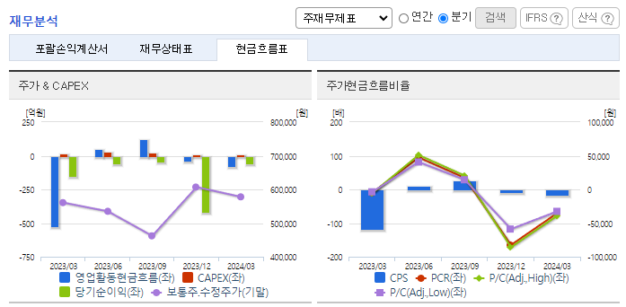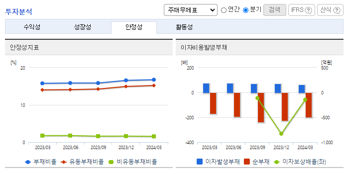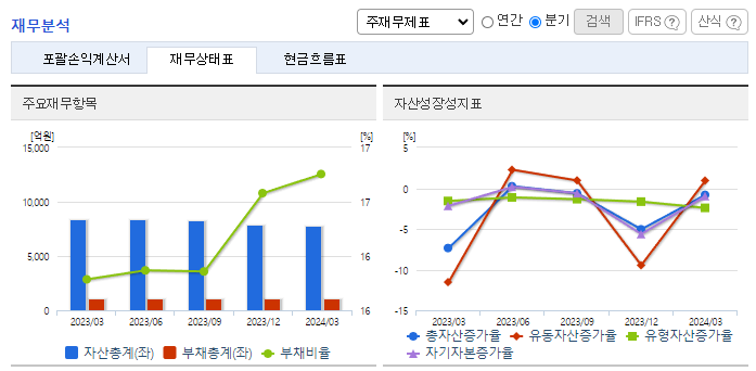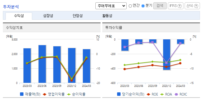 -2024년 3월 전년동기 대비 연결기준 매출액은 2.4% 감소, 영업손실은 52.8% 감소, 당기순손실은 63.4% 감소. 전체 사업부문에서 매출이 감소하였으며 수출부문에서 18.8%, 내수부문에서 1.2%가 감소함. 그럼에도 불구하고 원가 및 판관비 관리를 통해 손실은 감소함. 동사 창업주 일가 모두 경영진에서 사임하고 사모펀드 한앤컴퍼니가 경영권을 갖게 되면서 오너리스크를 해소하고 경영 정상화에 주력할 예정.