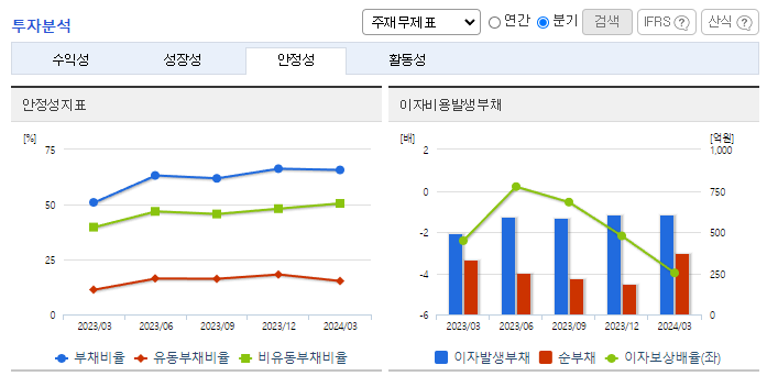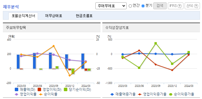 -2024년 3월 전년동기 대비 연결기준 매출액은 9% 증가, 영업손실은 274.3% 증가, 당기순손실은 1470.9% 증가. 동사의 2024년 1분기 매출액은 전년동기 대비 다소 증가하였지만 매출원가가 증가하고 운반비, 지급수수료 등과 같은 판관비 또한 증가하여 손실폭 또한 크게 증가하였음. 적극적인 영업전략 및 신모델 개발 등을 통해 시장 변화에 능동적으로 대처하여 수익성의 개선에 노력하고 있음.