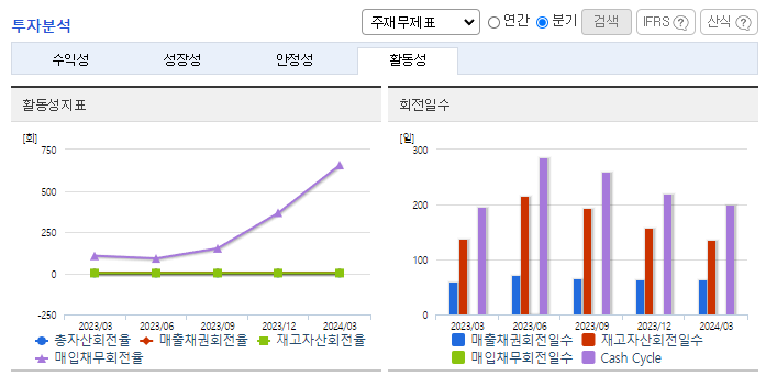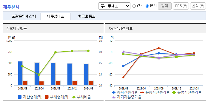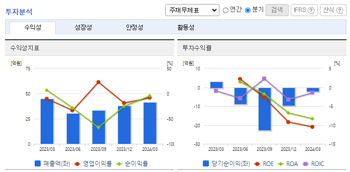 -2024년 3월 전년동기 대비 연결기준 매출액은 3.5% 감소, 영업손실은 56.6% 감소, 당기순이익 적자전환. 매출액은 소폭 감소했지만, 매출원가와 판관비가 16.0%, 5.3% 감소하면서 영업이익에 긍정적인 영향을 줌. 경기침체와 전방산업의 업황 부진으로 인해 악화된 영업환경이 이어지고 있음. MLC 사업부문이 30.60% 감소하면서 외형 성장에 악영향을 줌.