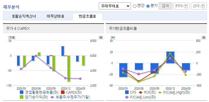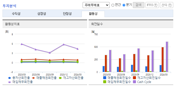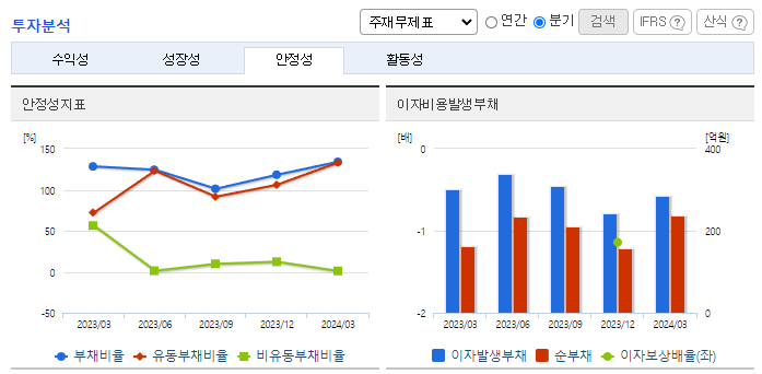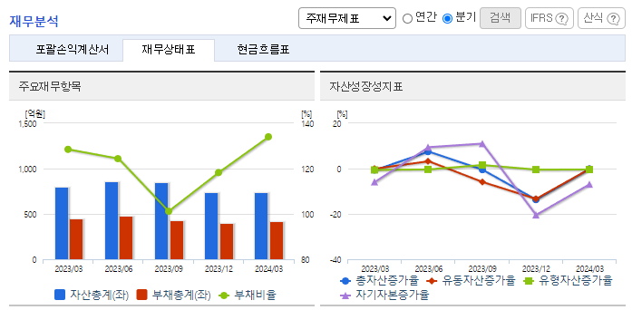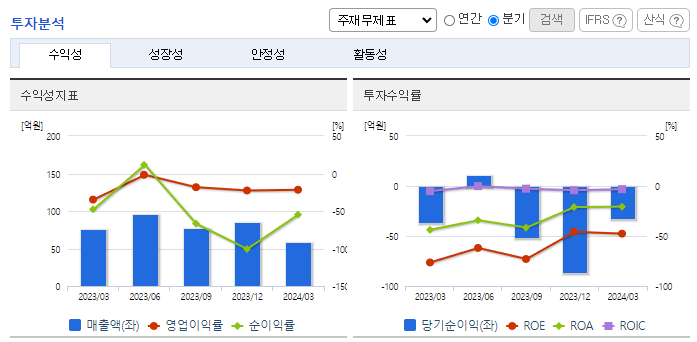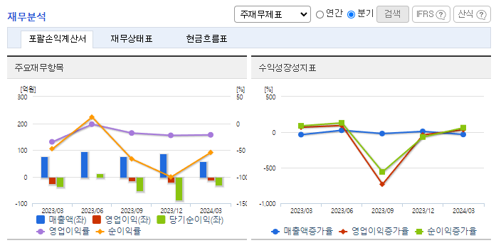 -2024년 3월 전년동기 대비 별도기준 매출액은 22.8% 감소, 영업손실은 51.8% 감소, 당기순손실은 11.7% 감소. 선박자동식별장치 등 선박통신장비 부문의 실적 부진으로 매출 감소, 비용 통제 에도 불구하고 영업손실과 순손실을 보이며 적자지속. 레저보트시장을 대상으로 매출원을 다변화, 디지털 항해ㆍ통신장비 등의 신규시장이 형성됨에 따라, 디지털 MF/HF송수신기, e-Nav 선박단말기 등 신규 매출원을 확대 중임.