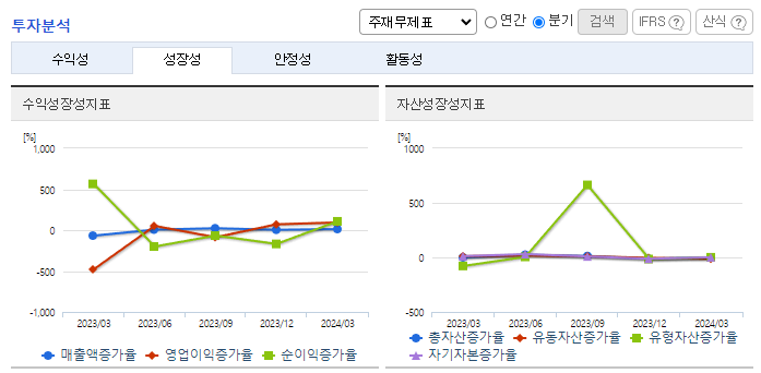 -2024년 3월 전년동기 대비 연결기준 매출액은 53.6% 증가, 영업손실은 98.4% 감소, 당기순이익은 64.3% 감소. 동사는 2020년, 2021년 및 2022년 감사의견 의견거절에 따라 상장폐지 사유가 발생함. 이와 관련하여 상장적격성 실질심사 대상 결정을 사유로 2021년 03월 26일~개선기간 종료('24.12.28) 후 상장폐지 여부 결정일까지 주권매매거래정지됨.