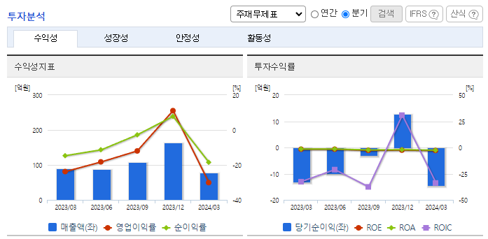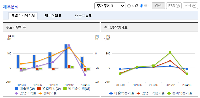 -2024년 3월 전년동기 대비 연결기준 매출액은 12.5% 감소, 영업손실은 10.7% 증가, 당기순손실은 10.4% 증가. 고객사 투자 축소 등으로 인한 수주 및 매출 감소로 인한 수익성 저하 및 인건비 단가 상승 등으로 발생되는 관리 비용 증가로 인해 영업이익 및 당기순이익 감소하였음. 동사는 통신 사업자 들과의 상호 협력 관계 구축, 신규 서비스 기술 확보로 시장 수요 창출 등을 판매전략으로 삼고 있음.