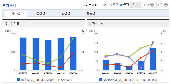 -2024년 3월 전년동기 대비 연결기준 매출액은 0.4% 증가, 영업이익은 168.4% 증가, 당기순이익은 378.3% 증가. 매출원가 20.2%, 판관비 4.1% 감소하면서 매출액이 소폭 증가한 것에 비해 영업이익이 대폭 증가함. 2024년 역시 글로벌 온라인 플랫폼 중심으로 미국, 동남아 등 다변화가 이루어져 수출은 증가할 것으로 예상. 비건 및 클린뷰티 등에 대한 관심 증가에 따라 동사 '체이싱래빗' 브랜드 마케팅 노력 중.