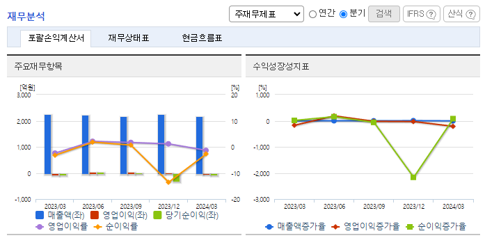 -2024년 3월 전년동기 대비 연결기준 매출액은 3.5% 감소, 영업손실은 45.6% 감소, 당기순손실은 17.9% 감소. 입체적 독서경험을 테마 도서에 적용한 '디즈니 인터랙티브 리딩' 시리즈 출시를 통해 시장의 큰 호응을 얻었음. 양질의 도서와 온·오프라인 학습 콘텐츠를 결합한 '웅진북클럽'과 AI 기술이 적용된 '웅진스마트올' 제품은 지속적인 개발을 통해 앞으로 스마트 시대의 교육시장 선도에 노력.
