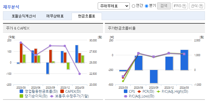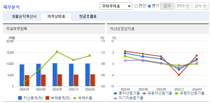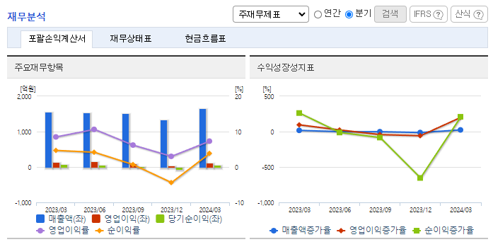 -2024년 3월 전년동기 대비 연결기준 매출액은 6.5% 증가, 영업이익은 8.5% 감소, 당기순이익은 14.8% 감소. 주요 상품인 하드캡슐과 건강기능식품 부문의 매출증가로 외형 성장함. 젤라틴과 의약품 매출은 소폭 감소하였으나 화장품 산업 회복에 따라 성장 기대. 건강기능식품의 매출 비중은 2022년 40% 대비 8% 감소한 32% 수준을 기록 중이나 하드캡슐부문이 꾸준히 성장 중.