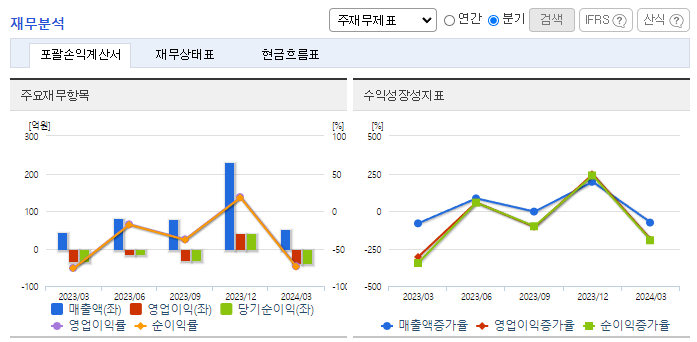 -2024년 3월 전년동기 대비 별도기준 매출액은 19.3% 증가, 영업손실은 15.4% 증가, 당기순손실은 15.9% 증가. 원재료 가격 상승과 함께 매출원가와 판관비가 17.2%, 18.6% 증가하면서 외형 성장에도 불구하고 영업손실이 증가함. 국내 대기업 및 다국적기업이 주를 이루고 있는 초고압/직류 등 하이엔드(high-end) 전력기기 시장으로의 시장 진입을 목표로 연구개발을 실시하고 있음.