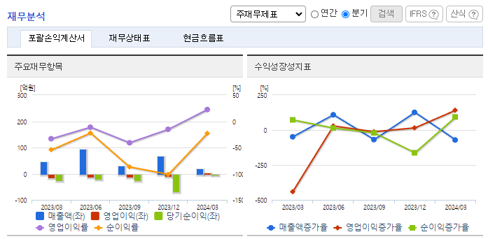 -2024년 3월 전년동기 대비 연결기준 매출액은 57.9% 감소, 영업이익 흑자전환, 당기순손실은 85.2% 감소. 2024년에는 인도네시아의 탑 크리에이터 및 최고 제작진과의 파트너십을 통해 블록버스터 액션 영화 '13 Bombs'와 호러 영화 'Respati' 두 개의 인도네시아 작품의 부분투자 및 공동제작을 하고 있음 해외배급 대행을 진행하며 글로벌 사업을 본격화할 계획임.