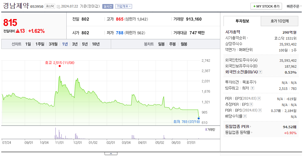 경남제약은 제약 기업으로 장중 기준으로 주가는 802원입니다. 경남제약의 시가 총액은 290억 원이며 발행 주식수는 35,593,402주입니다. 외국인 보유 비중은 0.53%이며 장중 거래량은 913,160를 기록했습니다. 24년 1분기 매출액은 177억 원, 영업이익은 -8억 원을 달성했으며, EPS는 -31원입니다. 경남제약 주식 배당수익률은 없습니다.