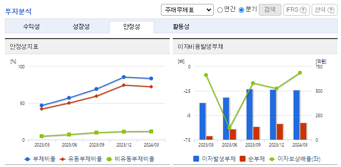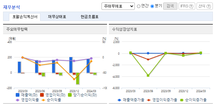 -2024년 3월 전년동기 대비 연결기준 매출액은 21.4% 증가, 영업손실은 265.9% 증가, 당기순이익 적자전환. 당기손익-공정가치측정금융자산평가손실 851,368(천 원) 및 거래일이연손익상각 447,459(천 원)이 발생함에 따라 금융비용이 증가함. 레모나 톡톡, 레모나 키즈, 레모나 젤리 등 레모나 라인업 식품이 꾸준한 성장을 보이며 추가매출 상승 요인으로 작용될 것이라 기대됨.