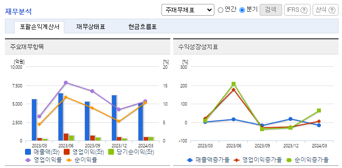 -2024년 3월 전년동기 대비 연결기준 매출액은 9% 감소, 영업이익은 48.3% 증가, 당기순이익은 105.9% 증가. 레미탈 사업부문을 제외한 시멘트, 레미콘, 기타 사업부문에서 매출이 감소하였으나 매출원가율 개선으로 인해 영업이익은 증가함. 전국 각지의 출하공장 및 저장소를 통해 효율적인 전국 유통망을 보유하고 있으며, 시멘트를 원재료로 사용하는 레미탈 및 레미콘 사업을 함께 운영하고 있어 시멘트의 안정적인 소비 가능.