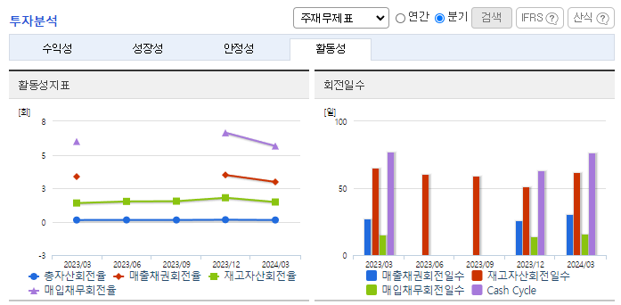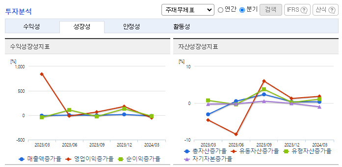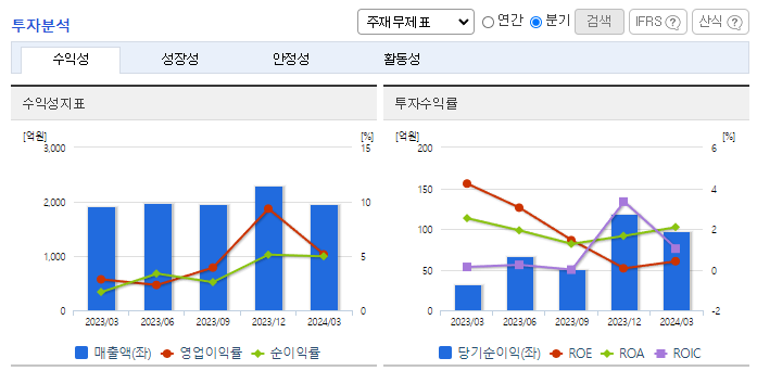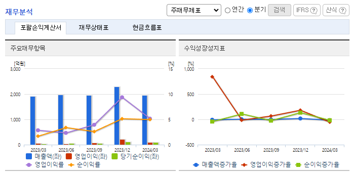 -2024년 3월 전년동기 대비 연결기준 매출액은 2.8% 증가, 영업이익은 85.8% 증가, 당기순이익은 172.5% 증가. 기계부품 사업부문은 주요 거래처인 현대, 기아차의 판매가 감소하였음에도 불구하고 8단 기어 적용차종 증가로 인하여 자동차부 판매는 증가하였음. 가전부품은 냉장고 판매 부진으로 전년대비 매출이 감소함. 전략적 컨트롤 타워로서 이를 조율하고 신사업을 발굴하는 역할을 수행하는 중.
