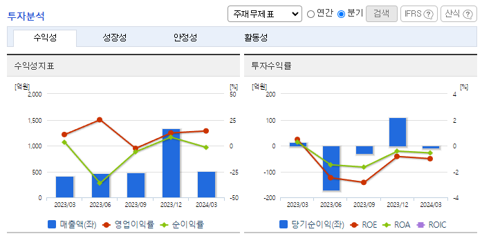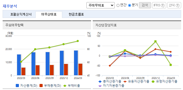 -2024년 3월 전년동기 대비 연결기준, 영업이익은 64.5% 증가, 당기순이익은 99.2% 감소. 정비사업 수탁 시장 내 점유율 1위 사업자로 70%의 점유율을 기록하고 있음. 도시정비 사업의 꾸준한 수주로 매출 수준 꾸준히 유지함. 1분기 역시 양호한 실적을 기록하였으나, 지분법손실로 당기순이익 적자전환함. 주택 분양경기 저하로 인해 이익창출력 회복에 어려움이 있을 것으로 예상함.