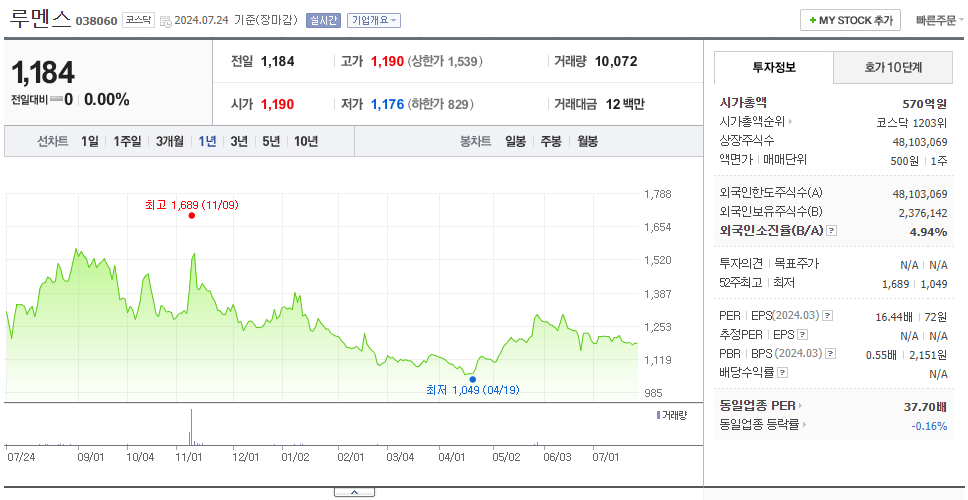 루멘스는 디스플레이 및 관련부품 기업으로 장중 기준으로 주가는 1,184원입니다. 루멘스의 시가 총액은 570억 원이며 발행 주식수는 48,103,069주입니다. 외국인 보유 비중은 4.94%이며 장중 거래량은 10,072를 기록했습니다. 24년 1분기 매출액은 392억 원, 영업이익은 12억 원을 달성했으며, EPS는 66원입니다. 루멘스 주식 배당수익률은 없습니다.