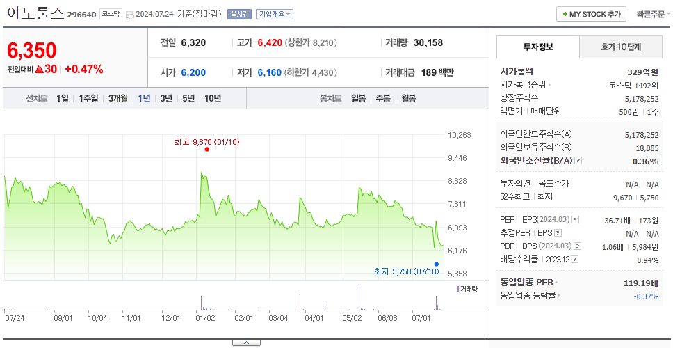 이노룰스는 일반 소프트웨어 기업으로 장중 기준으로 주가는 6,320원입니다. 이노룰스의 시가 총액은 329억 원이며 발행 주식수는 5,178,252주입니다. 외국인 보유 비중은 0.36%이며 장중 거래량은 30,158를 기록했습니다. 24년 1분기 매출액은 48억 원, 영업이익은 4억 원을 달성했으며, EPS는 111원입니다. 이노룰스 주식 배당수익률은 0.94%입니다.